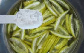 Bước 2: Ngâm vỏ bưởi đã thái sợi vào nước ấm và muối biển chừng 40 phút, nếu không nên dùng tay bóp cho bớt lượng tinh dầu có trong vỏ. Rửa sạch dưới vòi nước 3 lần đến 4 lần. Khi nào nếm thử thấy vị bớt đắng mà giữ được một chút vị the mát là được (điều này sẽ giúp khi thành phẩm mứt thì hương vị đặc trưng vẫn còn).